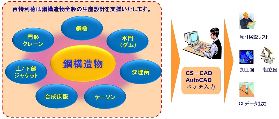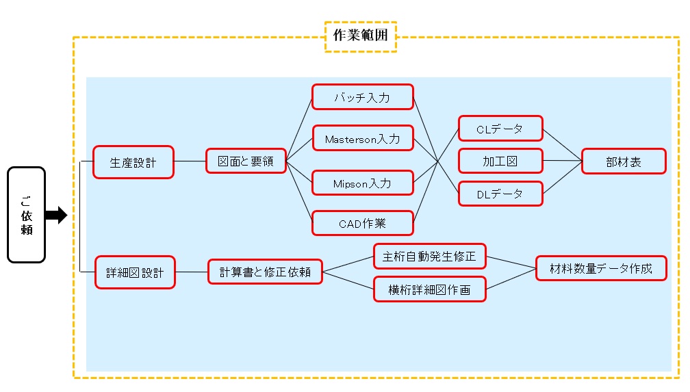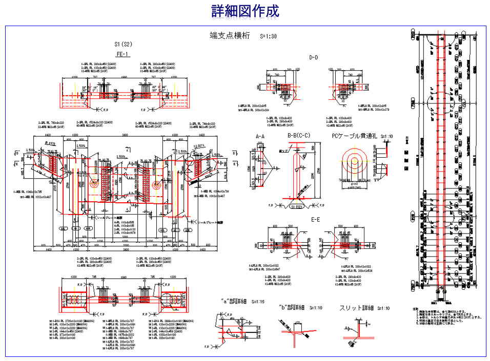 鋼橋をはじめ、あらゆる鋼構造物の原寸処理を提供いたします。専用のCADシステムを駆使しながらお客様のニーズに合わせ工場での製作に必要な図面やリスト類等の作成受託サービスを提供いたします。