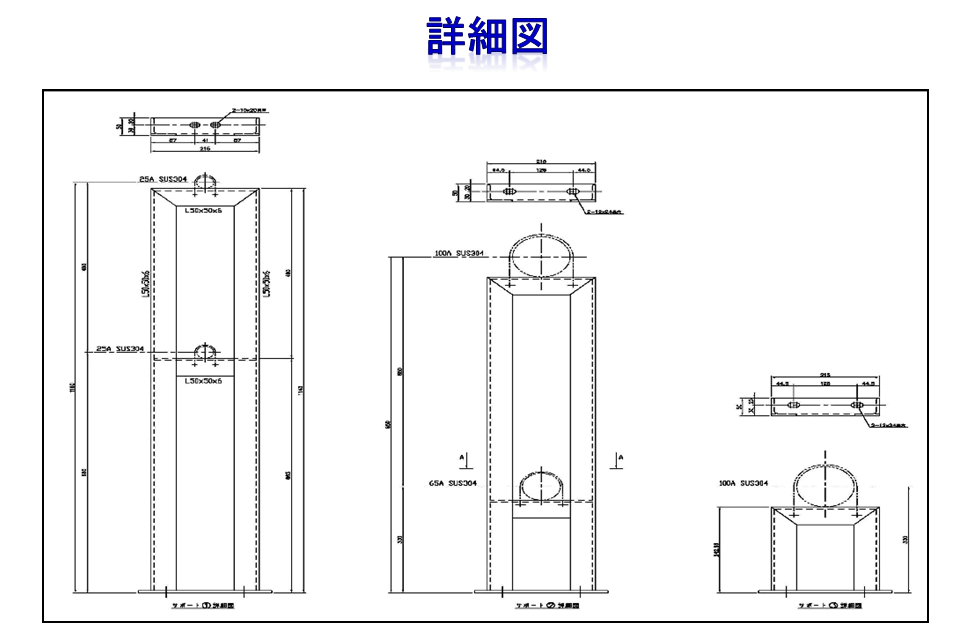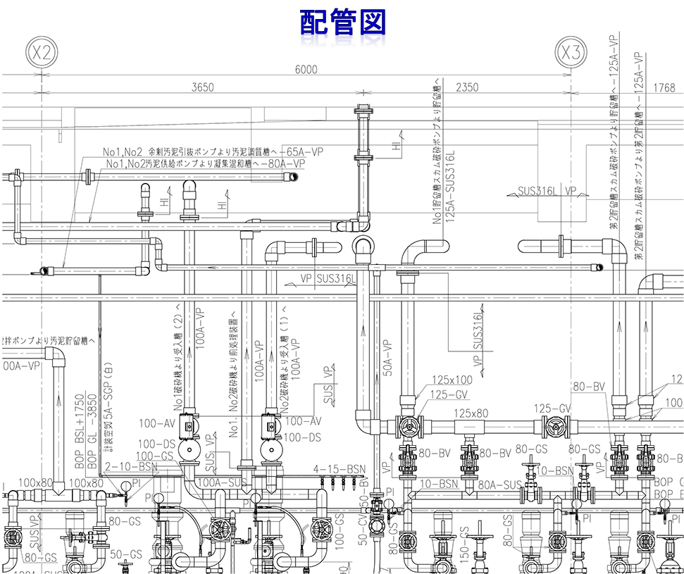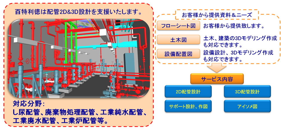 お客様から提供して頂く相関資料によって、 PLANT 3D 、 AUTOCAD 、 REVITを駆使 しながら工業配管設計、作図業務の受託サービスを提供しております。