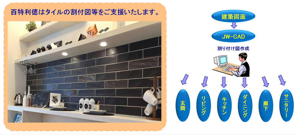 タイル設計等の作業を受託しております。JW-CAD等ソフトを駆使して、新築一戸建ての玄関、キッチン等の場所のタイル割付図を作成いたします。